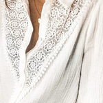Adopta la elegancia bohemia sin esfuerzo con esta blusa de encaje blanca de inspiración vintage, confeccionada en 100% algodón para una comodidad transpirable. Con detalles de encaje calado intrincados, mangas largas y una silueta femenina delicada, esta blusa es perfecta para superponer en primavera y otoño. Combínala con jeans o una falda fluida para un look bohemio atemporal.