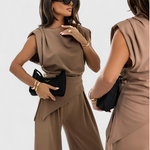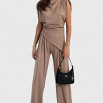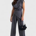 Elegancia escultural con un toque moderno: el conjunto Sofia combina un top asimétrico con pantalones de pierna ancha para una silueta que estiliza y fluye con gracia. Perfecto para ocasiones especiales o para elevar tu look diario con sofisticación sin esfuerzo.
