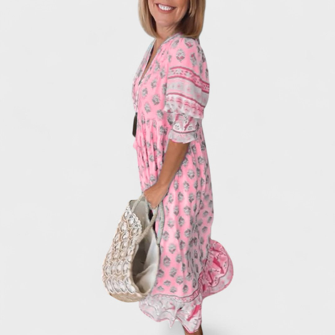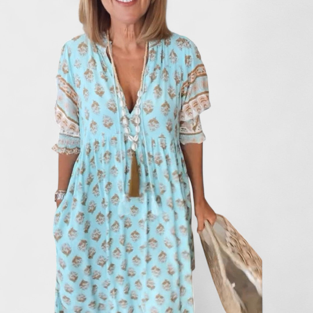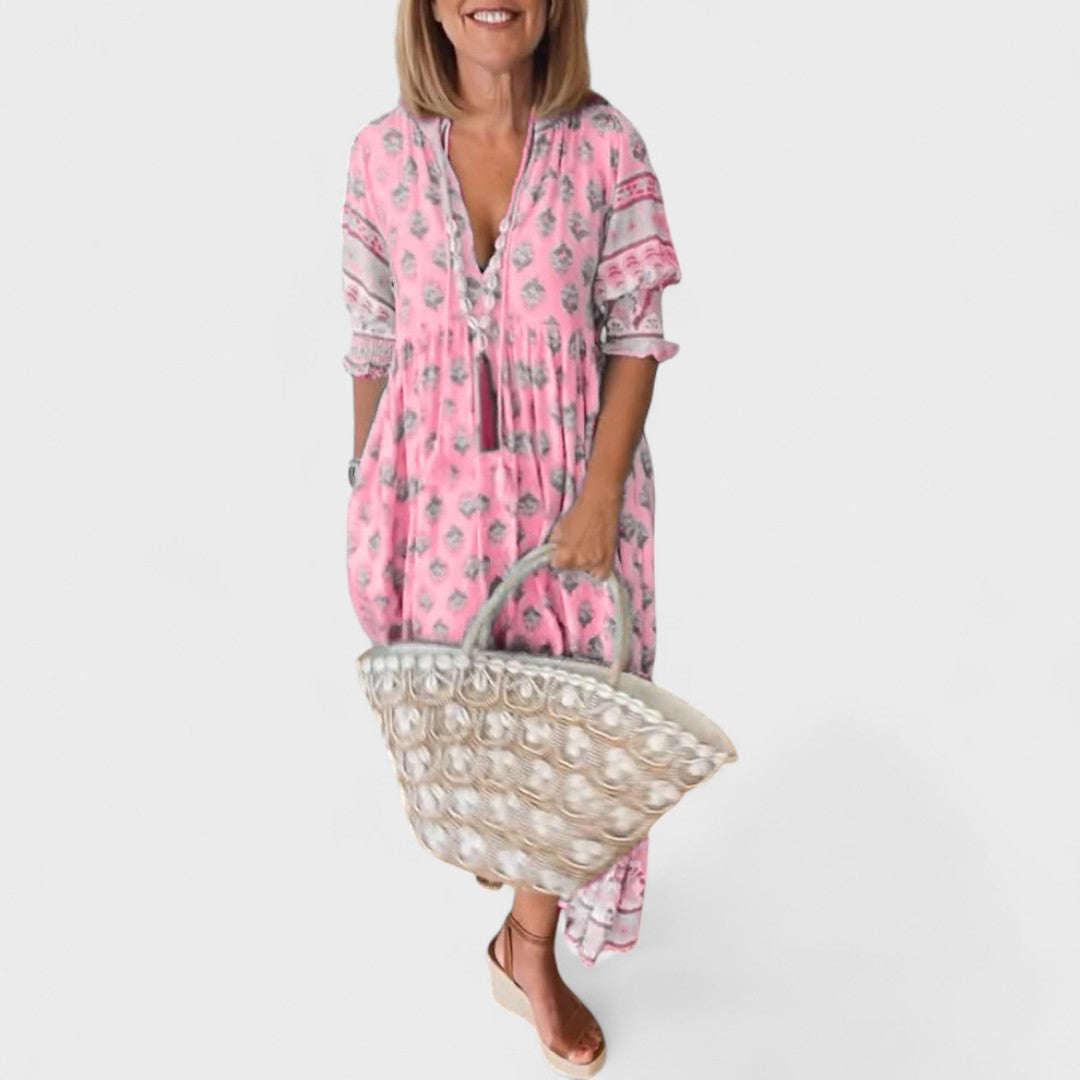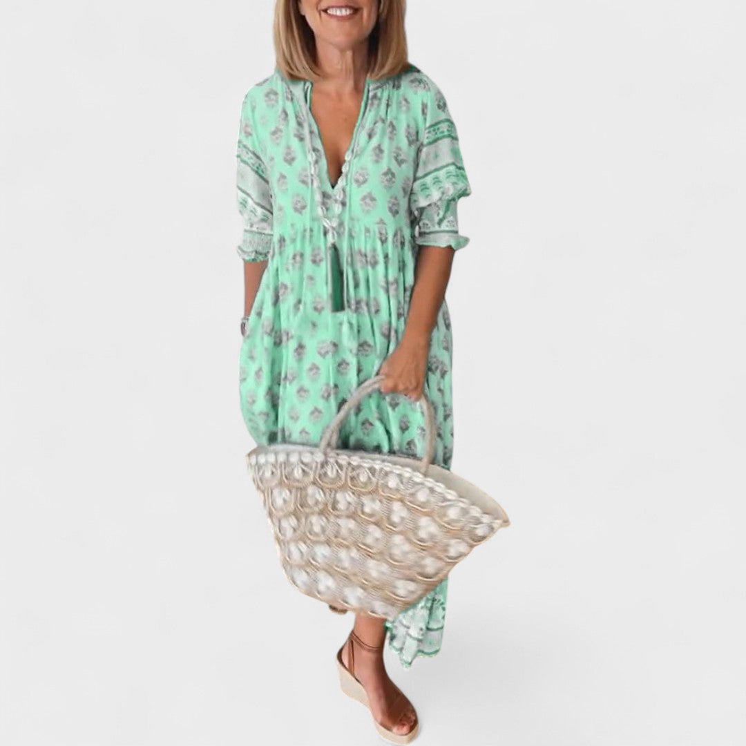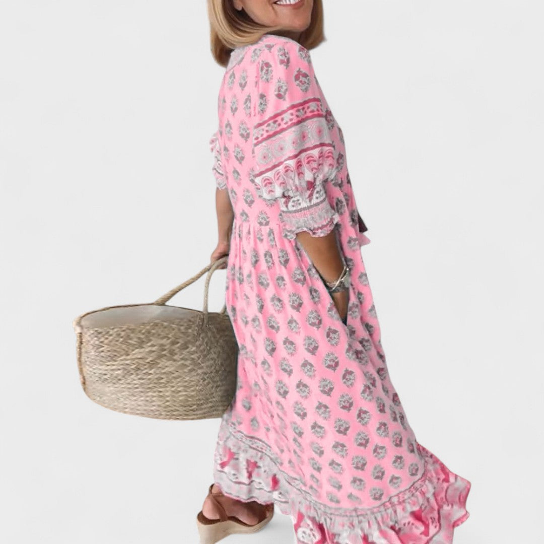 Un vestido fluido y lleno de estilo, pensado para quienes buscan combinar comodidad y elegancia con naturalidad. Ideal para acompañarte en días soleados con un aire bohemio y sofisticado.