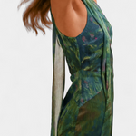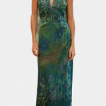 Inspirado en la paleta onírica de los jardines de Monet, el vestido Moana captura la belleza del impresionismo con cada detalle. Su caída ligera en chiffon premium, el cuello alto con abertura lágrima y la espalda cuadrada abierta evocan un romanticismo moderno. La bufanda separada añade un gesto de distinción, perfecto para ocasiones que merecen ser recordadas.